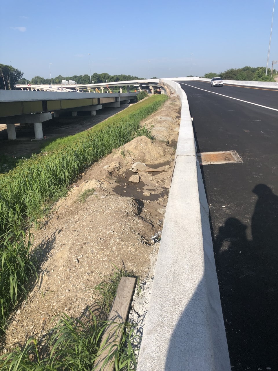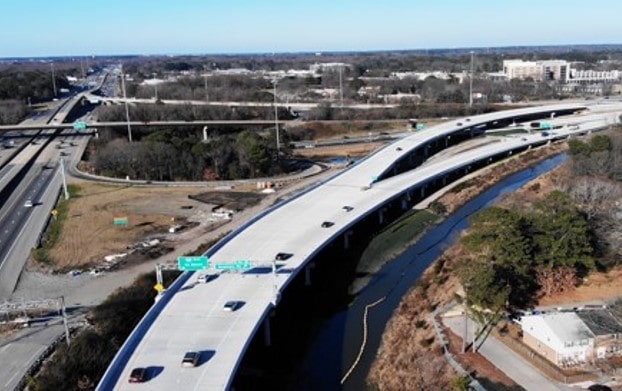 The scope of this $106.7M project included widening of 2.2 miles of I-64 westbound between the twin bridges and the I-264 interchange, a new two-lane flyover ramp from I-64 west to the existing I-264 east, a new two-lane I-264 east collector-distributor road, and a new exit ramp from I-64 west to the new I-264 east collector-distributor road.